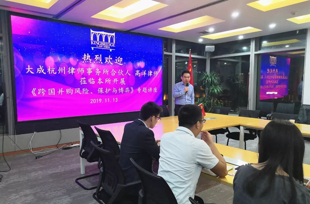 2019年11月14日,由广东金桥百信律师事务所涉外法律部主办的第79期【金桥讲堂】以《跨国并购风险、保护与博弈》为主题在本所24楼大会议室开讲,本次讲座邀请了大成杭州律师事务所合伙人、司法部千名涉外律师人才、浙江境外投资服务联盟服务专家高洋律师与大家分享,金桥百信高级合伙人王煌律师、冯梅律师参加了分享,并就有关跨国并购项目风险与博弈相互交流了心得与见解。梁丹律师担任本次讲堂的主持人。